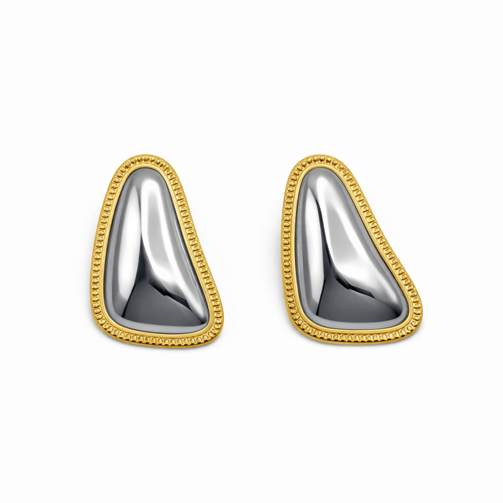 Un stud orgánico bicolor que enmarca la luz con un contorno texturizado. Arquitectura suave, presencia inmediata: el contraste oro/plata se siente moderno y editorial.